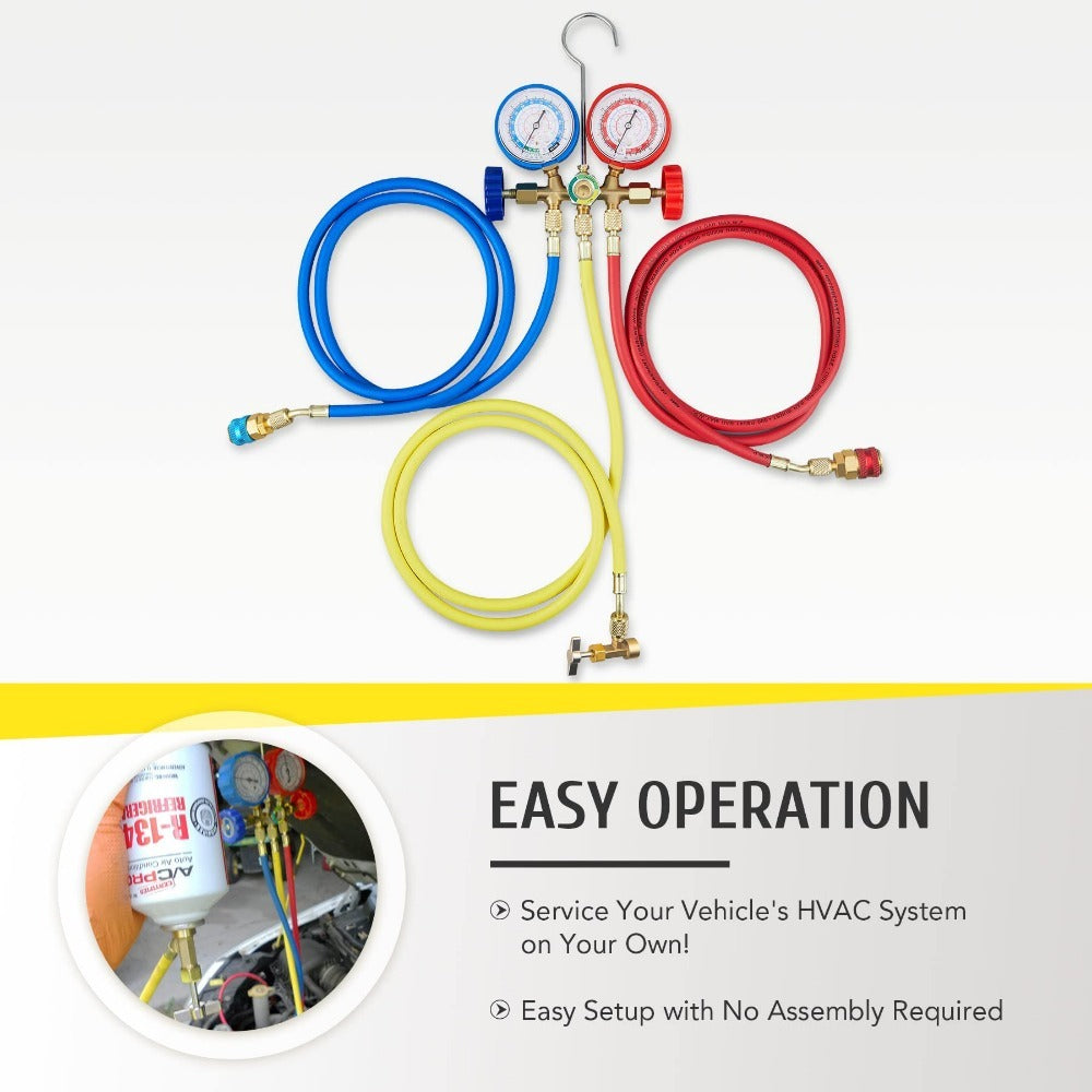 - WIDE APPLICATION: This car AC gauge set works with R134a, R12, R22, and R502 refrigerants; ideal for both DIY and professional HVAC maintenance, it allows you to measure your system's pressure, evacuate and refill coolant, and more