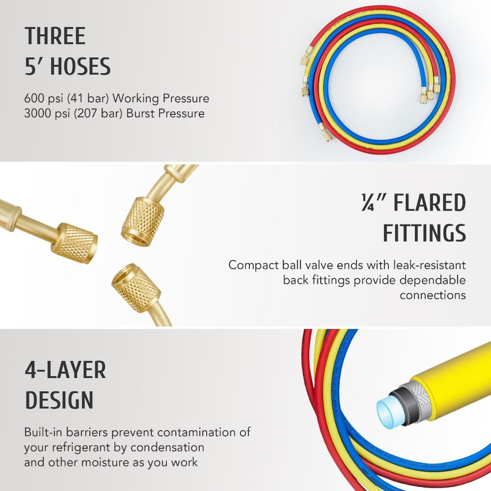 - COLOR-CODED HOSES: Blue for low, red for high, and yellow for charging, these durable PVC hoses have 4 reinforced layers to work with daily pressure up to 600 psi (burst pressure: 3000 psi)