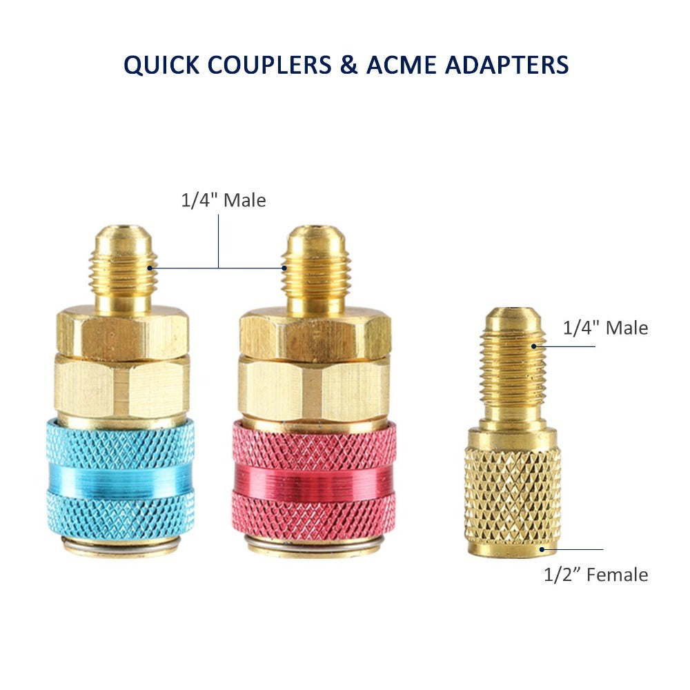 - COMPLETE GAUGE SET: This professional automotive AC tool kit from Orion Motor Tech includes a 3-way gauge, 3 color-coded hoses, 2 1/4'' quick couplers, a 1/4'' to 1/2'' 29° trap adapter; enjoy hassle-free setup and easy operation as you nip your HVAC problems in the bud